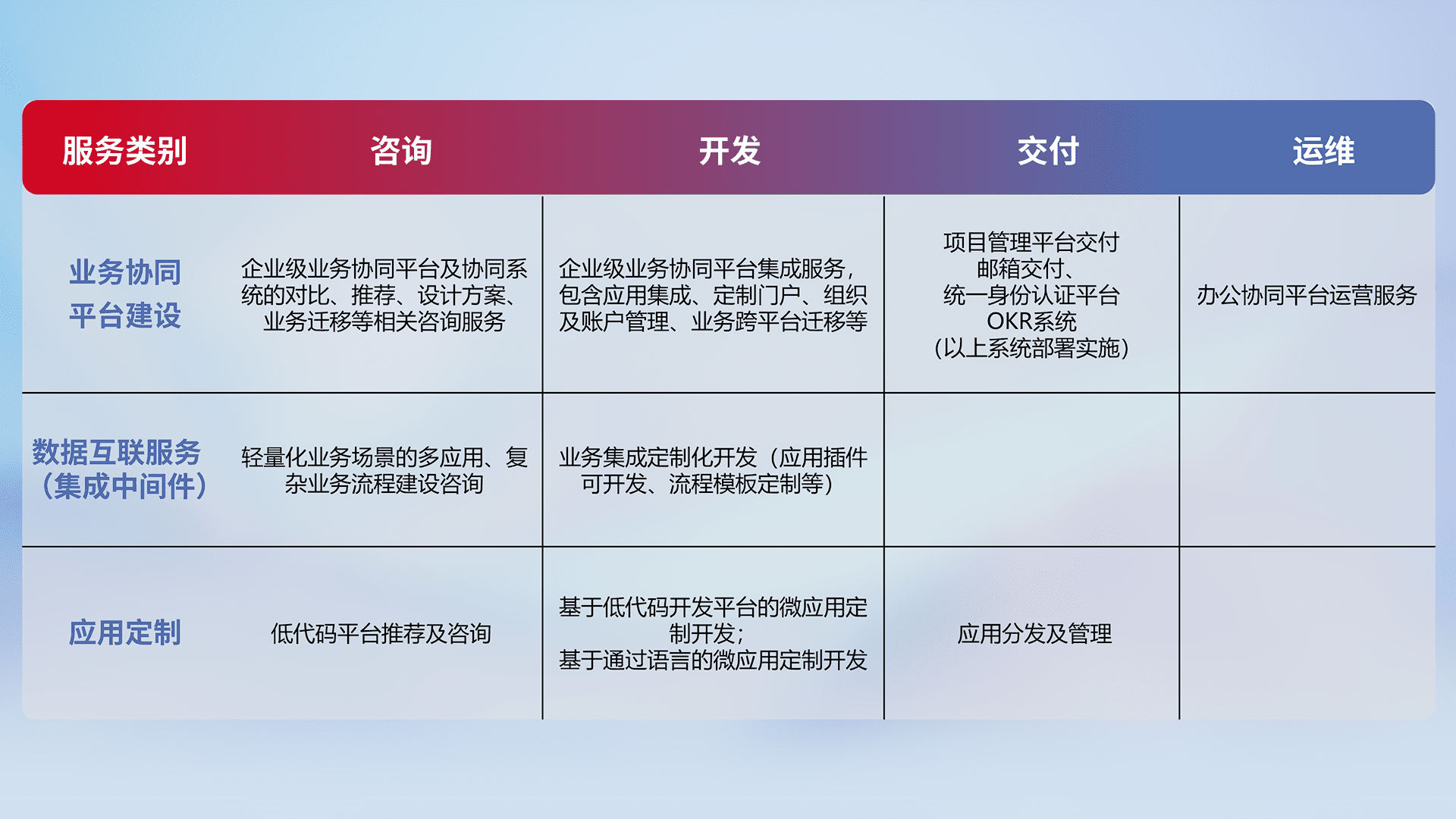 针对钉钉、、、、企微、、、IDaas等平台级产品提供产品的规划、、方案、、、交付、、、、定制化开发等服务,,,,实现如统一协同办公、、、、智能客户服务、、、混合会议管理、、、、智能数据查询、、、等业务场景,,,,实现数字化转型。。